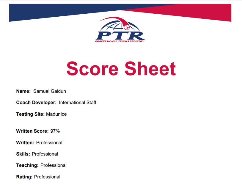 Tréner získal celosvetovo uznávanú licenciu americkej organizácie Professional tennis registry (PTS) s vynikajúcimi výsledkami, ktorá zaručuje klientom vysokú kvalitu tréningov.