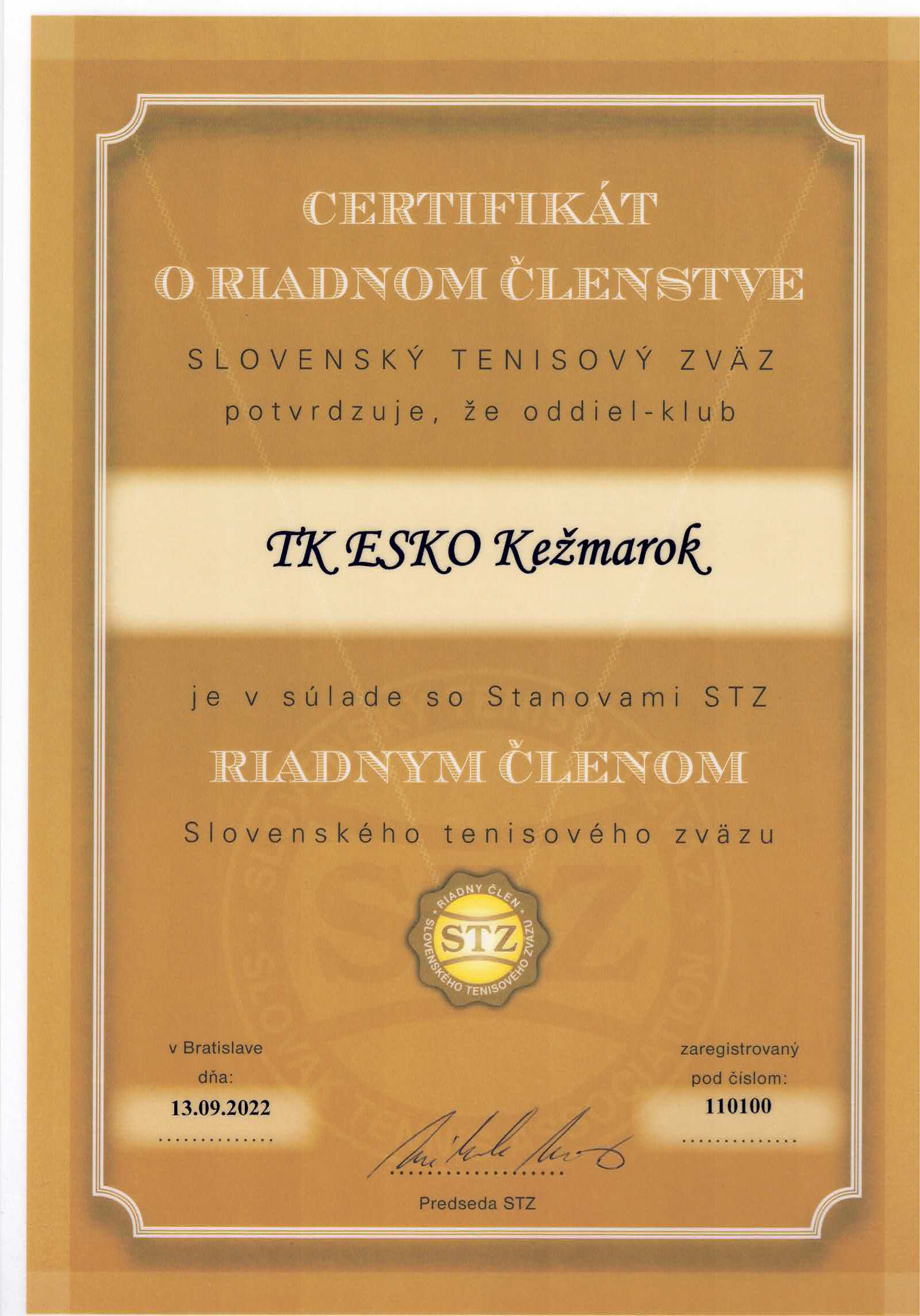 Úspešne sme získali Certifikát o riadnom členstve v Slovenskom tenisovom zväze, čo TK ESKO Kežmarok oprávňuje trénovať deti, dorast a dospelých.