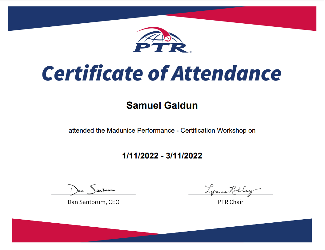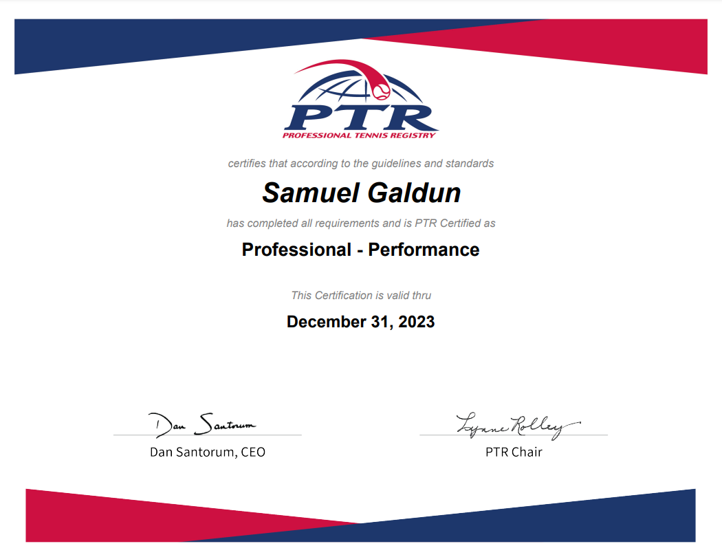 Tréner získal celosvetovo uznávanú licenciu americkej organizácie Professional tennis registry (PTS) s vynikajúcimi výsledkami, ktorá zaručuje klientom vysokú kvalitu tréningov.